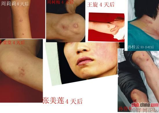 根据蓝天服饰公司提供的图像资料,多名女职工被派出所拘押了几天之后身上拍出的照片,还可以清晰的看到不同程度的青紫伤痕和流血的伤口等明显受伤痕迹。