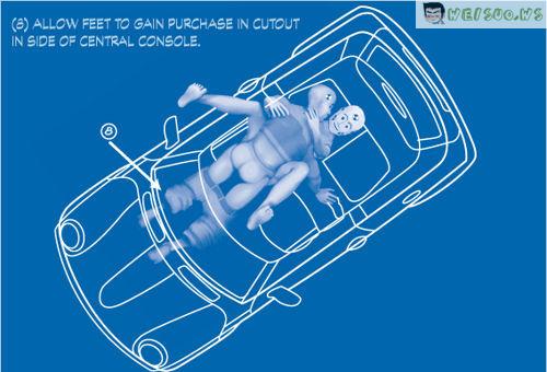 接着位于驾驶人的男性,可进一步探出身子,对性器开始爱抚,男方向助手座渐渐靠去,使座位往后倒,而个子高大的男性最好居于下方,这样比较容易结合,骑乘位是相当可行的体位。