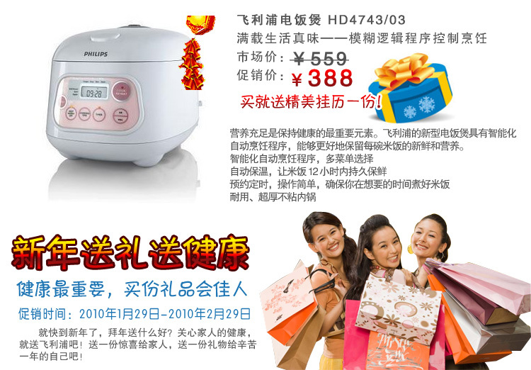 新年快到了,又到各位亲们对家人表达孝心、爱心时候到了,送他们一份健康的礼物,送上祝福一份吧!从2010年1月19日起至2月29日,我店推出飞利浦产品的优惠大酬宾活动。超值抢购哦!有买有送!我们的价格是全城最低的哦!全城产品不但可以自用,且是送亲朋戚友的最佳选择。