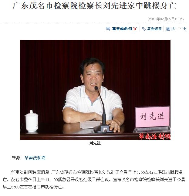[【热点关注】] 官场再地震 广东茂名市检察院检察长刘先进家中跳楼身亡