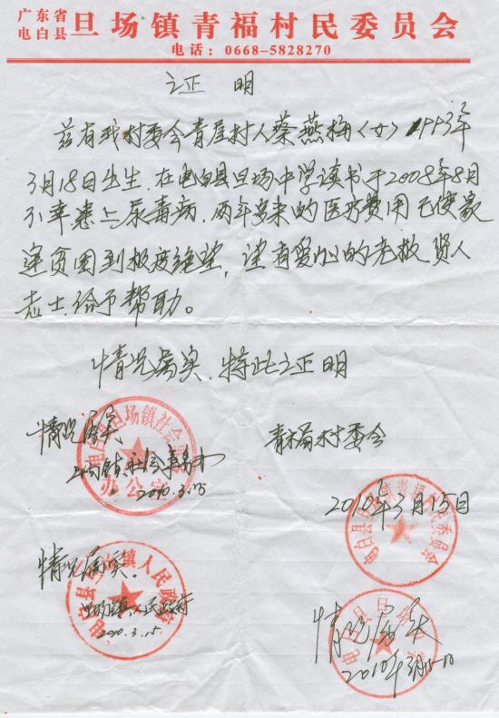 蔡燕梅家的地 址:广东省电白县旦场填青福管区青屋村