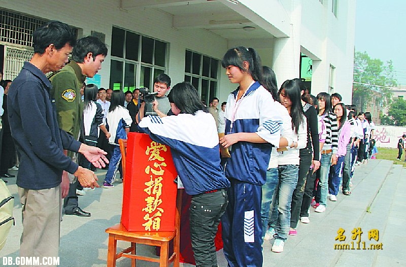 本报讯(记者梁爽)三月的阳光格外明媚,格外温暖。昨天下午,在电白县旦场中学,涌动着一股爱心暖流:在该校领导的带头下,全校师生踊跃为身患重病的蔡燕梅同学捐款(见上图,本报记者刘付思明摄),奉献自己的爱心……短短1个多小时时间,全校共收到师生捐款25000多元。当蔡燕梅的父亲接过这笔爱心款时,感动得热泪盈眶:“真是太感谢了,谢谢老师和同学们……”
