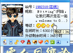 QQ等级太阳个数与所需天数! 闲来无聊算了一下QQ等级太阳个数对应的所需的天数,从我目测看,鼠标移到好友头像弹出的那个对话框,一排能显示7个太阳,两排就是14个太阳,如果每天都24小时在线,弄满太阳大概得30年,要是每天挂16小时,大概要45年,要是每天挂8小时(大多数也就能达到这个标准吧),大概要90年,哥们,好运,但愿你能活到那个岁数! [attachmentid=16665]
