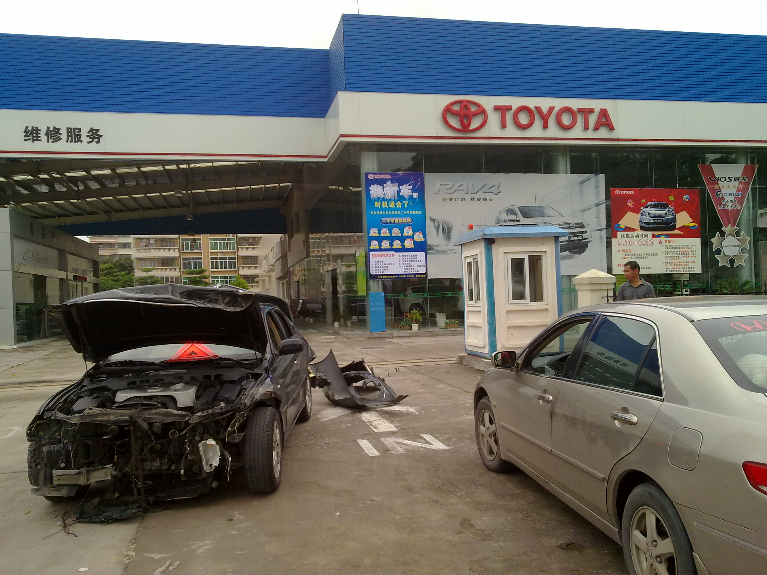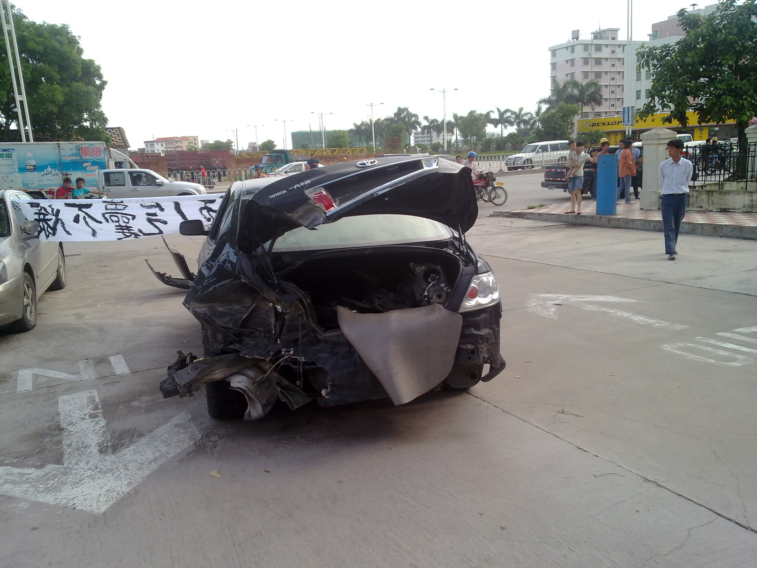六月十二号车主再次拉到了茂名一汽丰田的销售中心门口,并挂上了横幅。拉到不到五分钟围满了群众和当时在茂名一汽丰田销售中心看车的消费者,就连群众和消费者都说了车子撞成这样竟然不爆气囊实在说不过去,都为车主的遭遇感到愤怒,这时茂名一汽丰田的管理人员感到了事情的严重性,频频来找车主谈话了,相对之前2天的态度转变的很大,说他们不停的将情况报告给一汽丰田的公司,而后来和车主妥协了把车子拉离他们的销售中心,等待一汽丰田的专业技术人员下来检测车况。