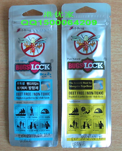 "Bugslock" 是一种散发100%自然香气的防蚊产品。当你把"Bugslock" 带在手腕和脚踝上时,它散发出来的气味可以阻止蚊虫的叮咬。"Bugslock"很容易配戴,在任何时间任何地点,想要使用它很方便,效果持续240小时,不想使用时请把它放回原包装保存。用完的"Bugslock"还可以放在汽车和卫生间里除异味。"Bugslock"无毒也无驱蚊胺是个很安全的产品,在全球,各种年龄的人们都在使用它。建议三岁以下的婴儿配戴在脚踝,而不是手臂上。