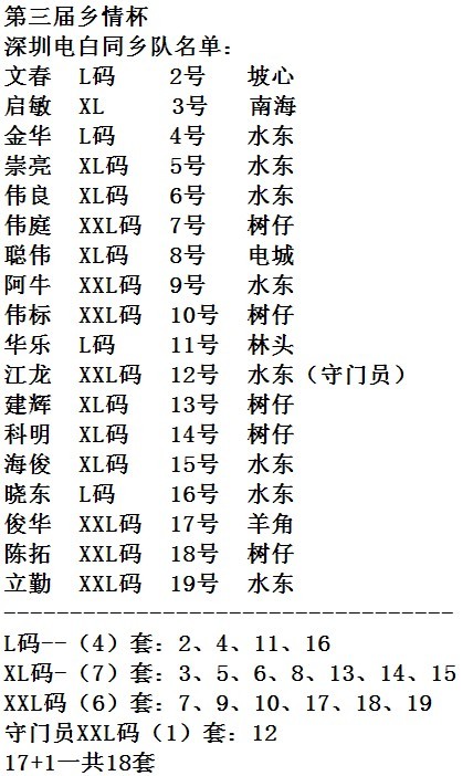 珠海队参赛人员名单(17人):0邓思海、1林敬黠、2王维仑、5叶丹、6张栋、7李锦权、10李健生、12陈荣越、13黄金山、15梁敏、16徐建国、18卢利嘉、20潘圆明、21徐礼杰、23吴志强、25张成尧、26杨阳。