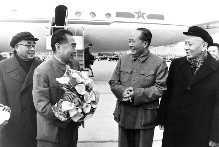 毛泽东、刘少奇、朱德到机场迎接从莫斯科归来的周恩来。