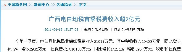 广西电白地税首季税费收入超2亿元 2011-4-19 17:16:00 文章来源:茂名日报