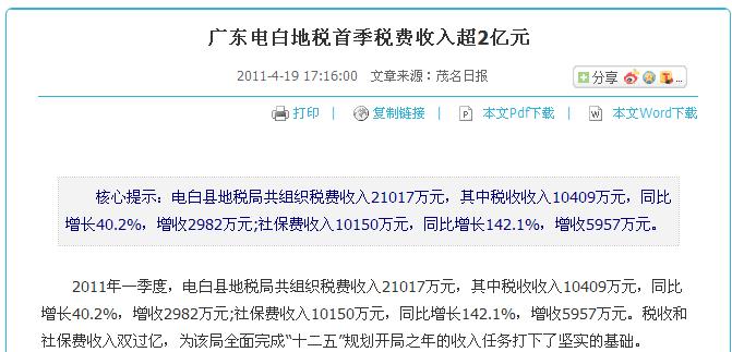 核心提示:电白县地税局共组织税费收入21017万元,其中税收收入10409万元,同比增长40.2%,增收2982万元;社保费收入10150万元,同比增长142.1%,增收5957万元。