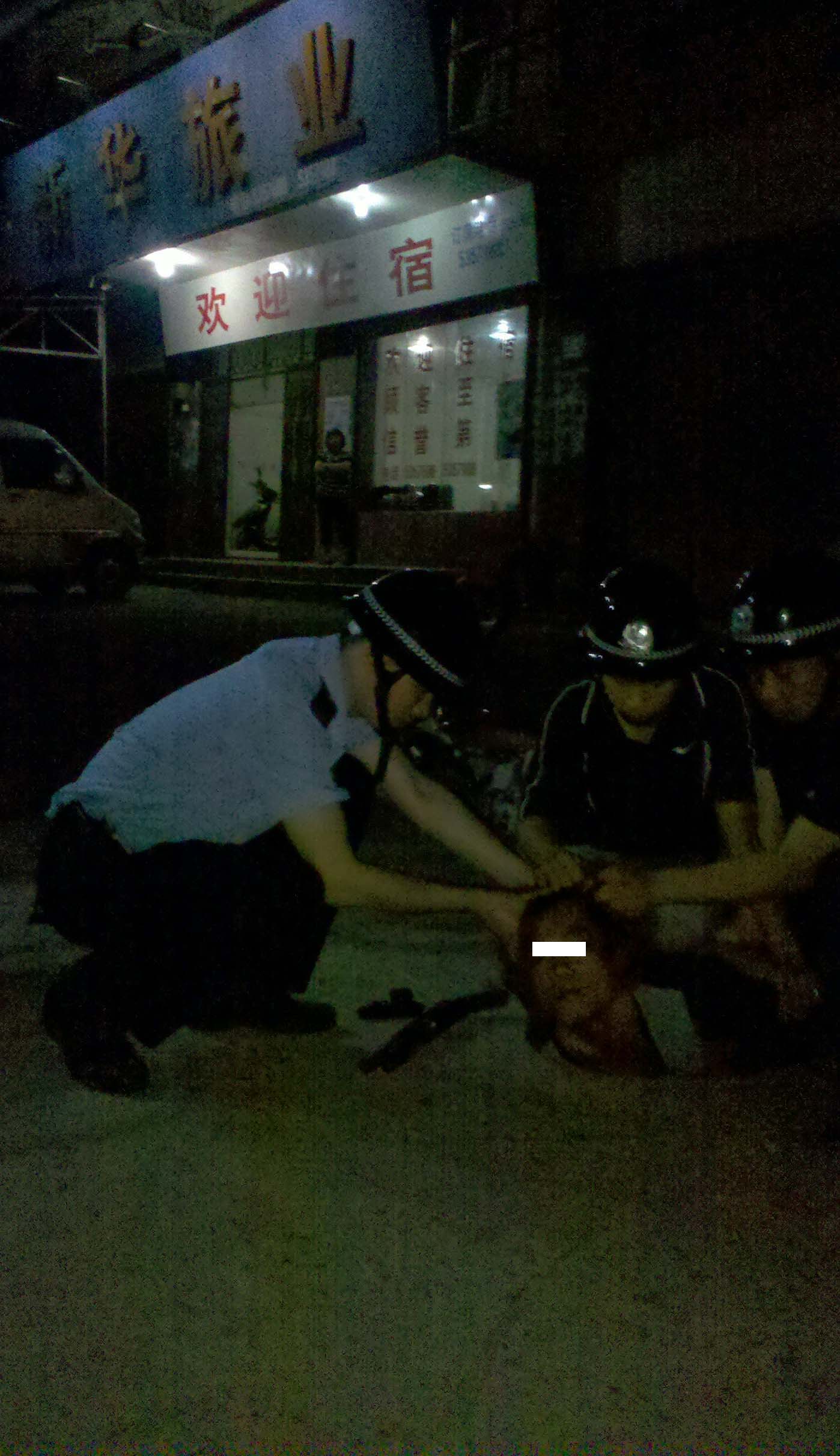 昨晚九点钟左右在电城东门头,看到电城警察抓人,有几个红头发的青年仔乱逃,当场抓到一个,我还看到两支枪,不是警察的枪,是匪徒的枪,一长,一短。不知是什么事。当时有幸看到,并拍了两张相片。匪徒的面部作了一下处理,免得这东西放出来后找我麻烦。