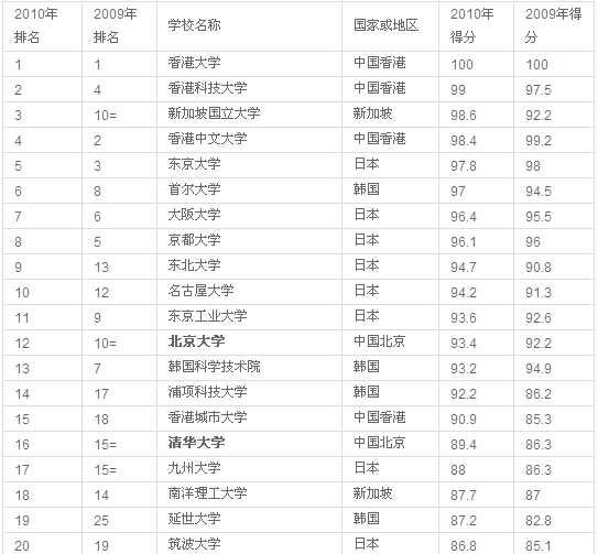 注:2010年与2009亚洲大学排名前20名单