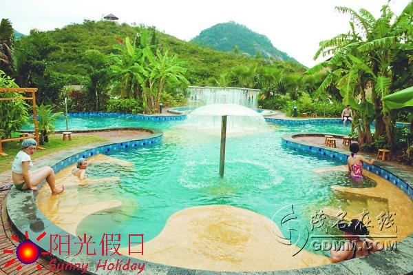 巴厘岛风情的温泉池区, 43个形状不一、功能各异的温泉池错落有致地分布在绿树林荫之中。温泉泡浴、温泉冲浪、温泉SPA、温泉鱼疗、温泉磁沙、养生保健、干湿蒸、水上拓展等项日一应俱全,让游客进入一个如天堂般的自然风光度假胜地。御水古温泉度假村的出现,即将成为粤西地区最热门的旅游胜地。
