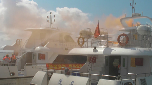 此时,“茂客1号”船机舱突然起火,浓烟笼罩着船尾,在船员扑救失败后,火势越发猛烈。海巡1568船、蓝凤凰38号在接到海事人员的命令后,相继赶到现场用水枪对事故船只的起火部位进行喷射。大火在10多分钟后被成功扑灭,经查实后确定船舶火场已无复燃的危险,随即,海巡1568船、蓝凤凰38号护送“茂客1号”返码头检修。直到中午10时10分,这场集船舶碰撞救助、海域落水人员搜救和船舶消防应急为一体的放鸡岛海上应急综合演习圆满结束。