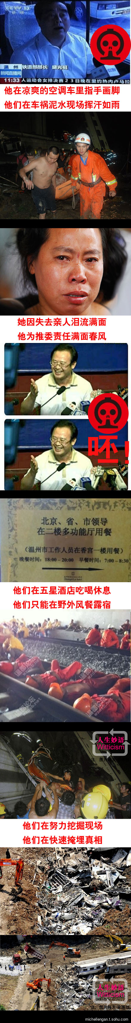 宋阳童鞋:看了铁道部新闻发布会就瞎琢磨:这事故要是发生在美国,铁道部人员掩埋车体之前,FBI就在第一时间封锁现场了;要是在日本,内阁又准备换届了;要是在法国,总统准备被弹劾了。但在我们的面前,大爱又开始升华了!!!靠!!!