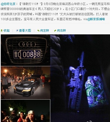 2011年9月6日晚10点左右,在北京海淀区马连洼北路西山华府南门,发生了一起恶性暴力事件:1对别克车主夫妇被车牌号“晋000888”的奥迪车主和无牌照的宝马车主暴打,夫妇二人被暴打至满头是血。打完人后,奥迪车主躲进车内,想要离开,宝马车主也发动汽车要走,别克车夫妇二人挡在车前,阻拦奥迪和宝马的去路,并扬言要报警,宝马车主气急败坏的下车继续殴打夫妇二人,并说:“让你报警,我爸是公安”,此时恰好在奥迪车后来了一辆西山华府业主的丰田越野车,正要离去的奥迪,被丰田挡住了退路,宝马车主见状赶忙跑到丰田车窗边说:“哥们儿,赶紧把车挪开,我给你2000块钱”!丰田车主无动于衷,继续挡在奥迪车后,奥迪车主见丰田车不买账,干脆直接倒车撞向丰田车头,丰田车主依旧不动,继续挡住奥迪和宝马的去路!别克夫妇二人站在奥迪车头前,挡住奥迪前路,宝马车主火大到极点,立刻上车,并且猛踩油门撞向别克夫妇,别克女车主吓到尖叫,并闪到旁边,男车主依旧挡在车前,宝马见不能吓退对方,并且对方也已报警,宝马车主索性下车锁起车门,扬长而去。奥迪车主随后也下车逃离现场。15分钟后,警察终于赶到了现场,在一群围观的群众当中,警察拍了几张照片后,就打发别克夫妇先去医院,随后解决事情!