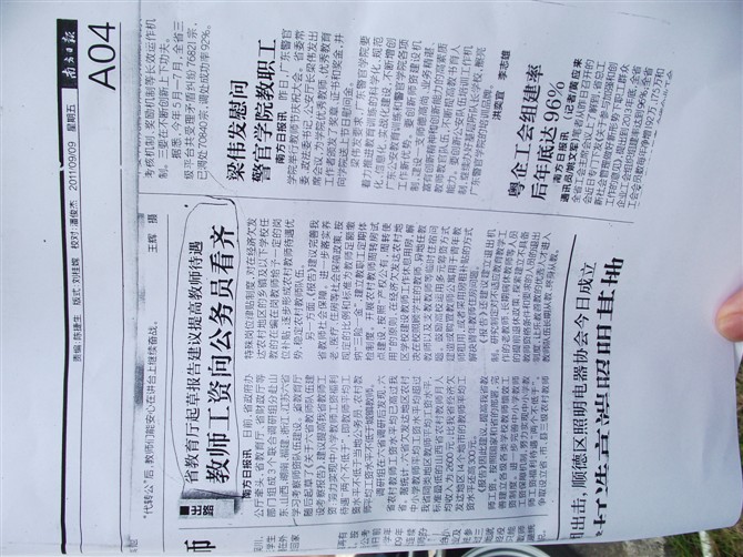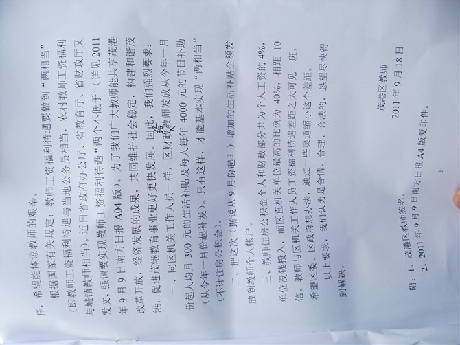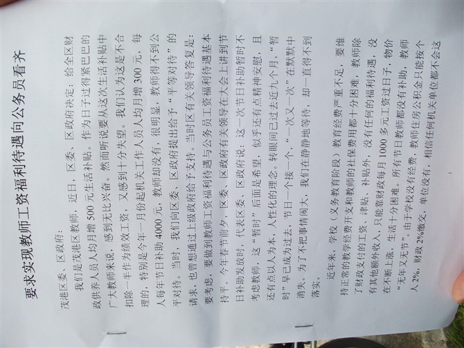 QUOTE(金戈铁马 @ 2011年09月19日 Monday, 02:42 PM) 横幅标语让教育局副局长吴志雄没收了,所以未拍摄到。 [snapback]3221213[/snapback] 晕,有点笨,应该先拍那个重要的!这样人家还以为你们在旅游呢!另外,你们现场起码几十人吧,怎么会给那个鸟副局长这鸟官抢了你们的标语的,一人一口水淹死他啊!!!