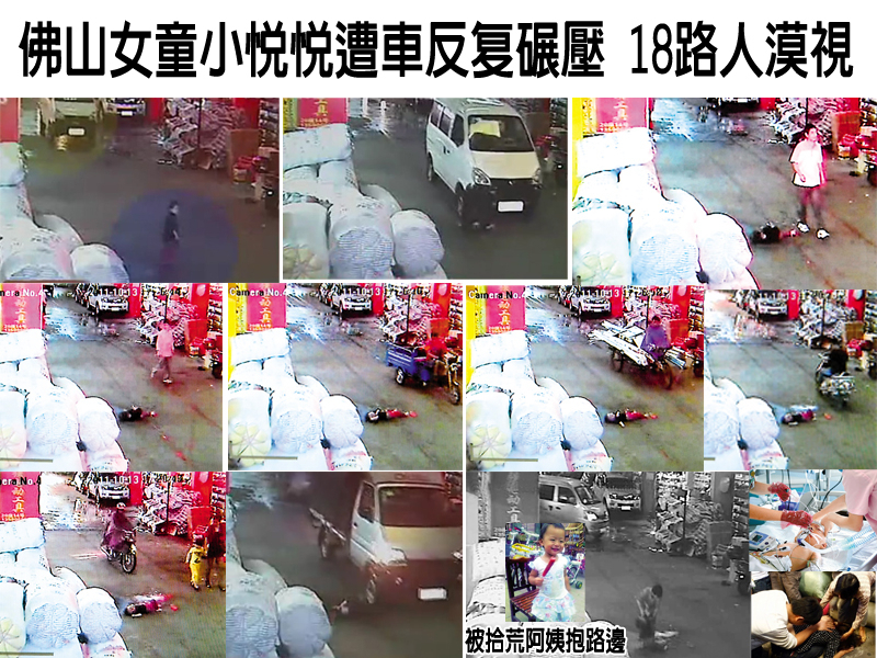 广东佛山一名2岁女童先后被厢型车及货车辗过,前后7分钟有18个路人经过却视若无睹(网络图片)