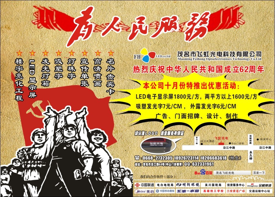 茂名市飞虹光电科技有限公司十月特推出优惠活动.LED电子显示屏1800元/方,两平方以上1600元,吸塑发光字7元/CM,外露字6元/CM,广告门面招牌设计制作。地址:茂名市沿江路68号(中山门诊部旁边、沿江大厦旁边)欢迎来电询!18926723114/18206683618 杨生