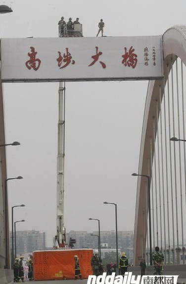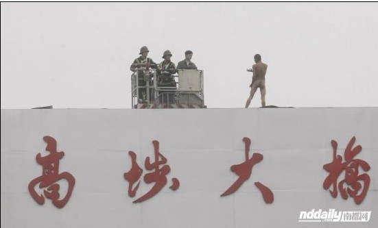 昨日上午9点左右,一名疑患有精神病的男子全身赤裸地爬上高洞笄徘哦ィ并不时在离地面二三十米高的桥顶来回走动玩耍,更声称自己是“孙悟空”。一个半小时之后,消防队员利用裸男的心理,巧妙引用西游记中唐僧收徒的情节,将裸男劝下。