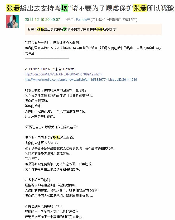 12月19日她在豆瓣社区呼吁大家关注乌坎事件,她更清楚说明为了对有良心的人的支持,将来自己的音乐事业是否顺畅,她并不计较。她豁出去了,美女歌手张悬豁出去声援乌坎,中国娱乐界第一人。