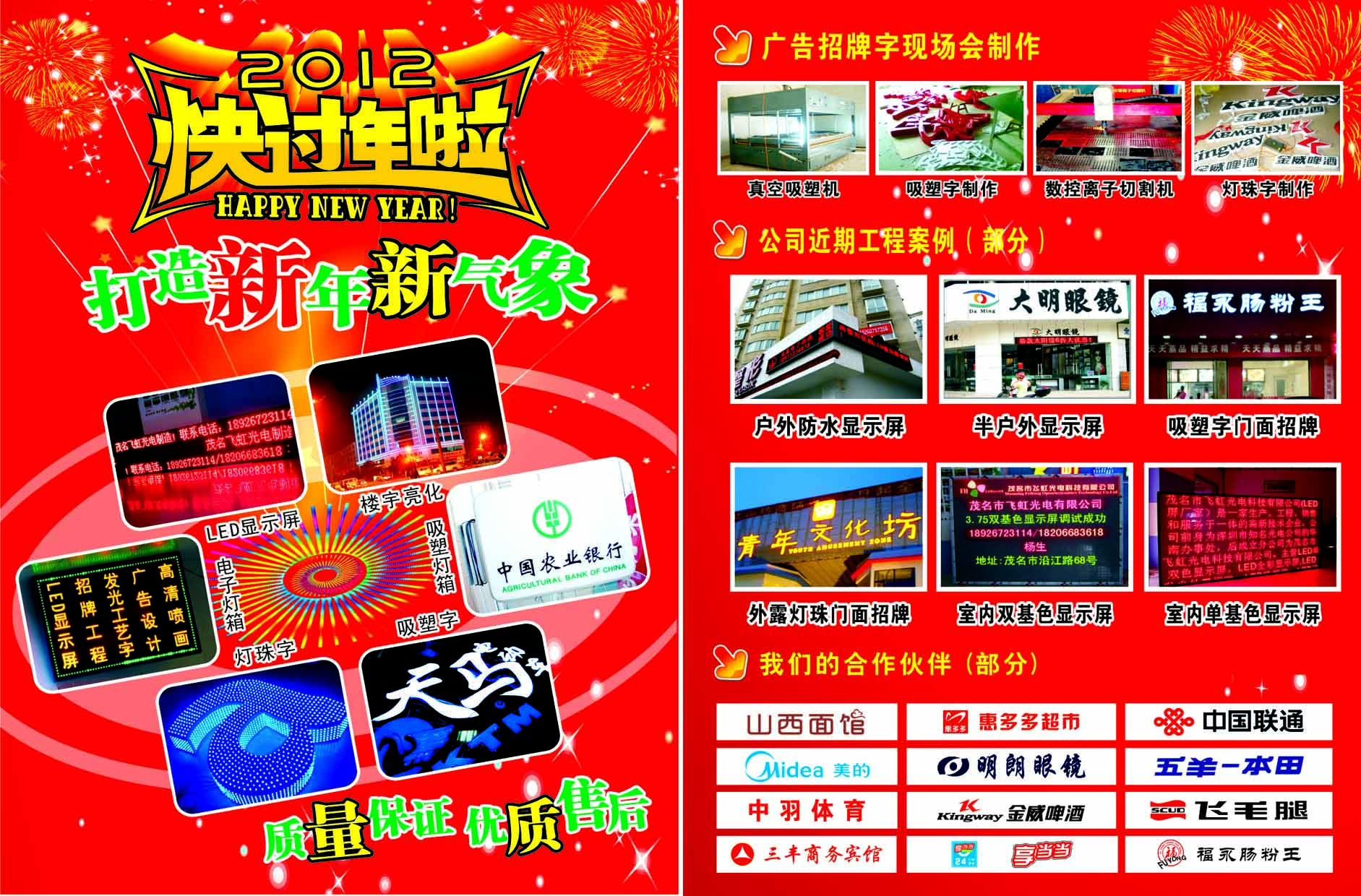 Y ygp841130 学前班 注册 2010-05-13 消息 32 反馈评分 0 点数 0 2011-12-24 #1 [attachmentid=287857]快过年啦,打制新年,新气象!我是茂名市飞虹光电的杨生,公司专业制作LED发光招牌,KTV亮化工程,LED电子显示屏制作、安装、维修,广告设计制作安装等!业务联系:18926713114/18206683618,地址:茂名市沿江路68号(沿江大酒店左侧)。如想知更多公司业务内容,可上百度搜索《茂名飞虹光电》打扰了! 附件 快过年了.jpg 462.5 KB · 查看: 313