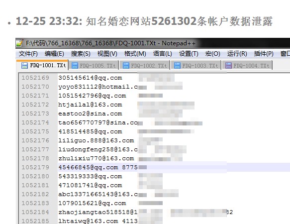 12月25日:知名婚恋网站5261302条帐户信息证实...