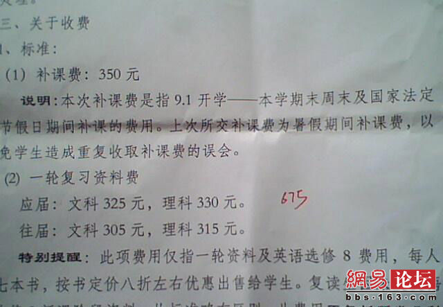 7月19日秭归一中高三补课学生已交齐各项费用1750元 后来又陆续上缴费用 前段时间的578高考报名费 据我所知 别的学校交的都比我们少 元旦放假一天 交675(文科)680(理科) 其中包括补课费350元 资料费325元 而明年报名又要交补课费和资料费 高三补课大约补到腊月二十七就要放假 这半年文科也只发了一本英语选修九 需要325吗?天价英语书吗?这里的资料费还不包括英语听力书高考真题等资料 何况开学就已经交过第一轮复习资料费了 一中是差钱 但是至于从学生那里乱缴费吗?很多学生已经将此消息发布在各大网站。