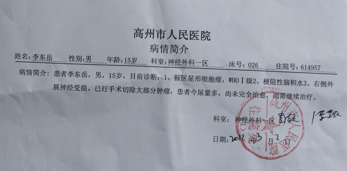 QUOTE(我只是老师 @ 2012年03月01日 Thursday, 09:59 PM) 义工团在今晚已联系我,了解李东岳同学的基本情况,在此非常感谢他们,用热心行动来帮助我们的李东岳同学。 [snapback]3330572[/snapback] [attachmentid=291737] [attachmentid=291738] [attachmentid=291739] 您给我发的图片已经收到并选择了部分上传。 希望有热心人士能到高州医院与其主治医师接触并得到治疗方案。