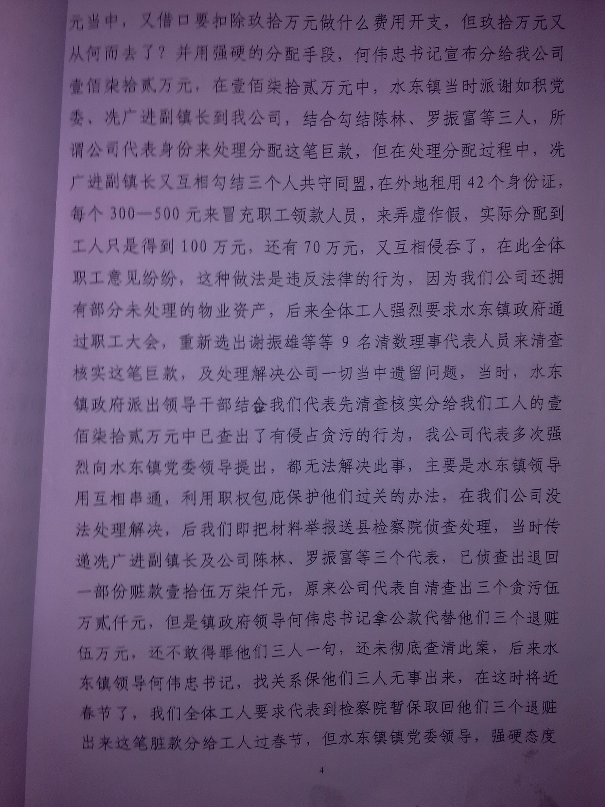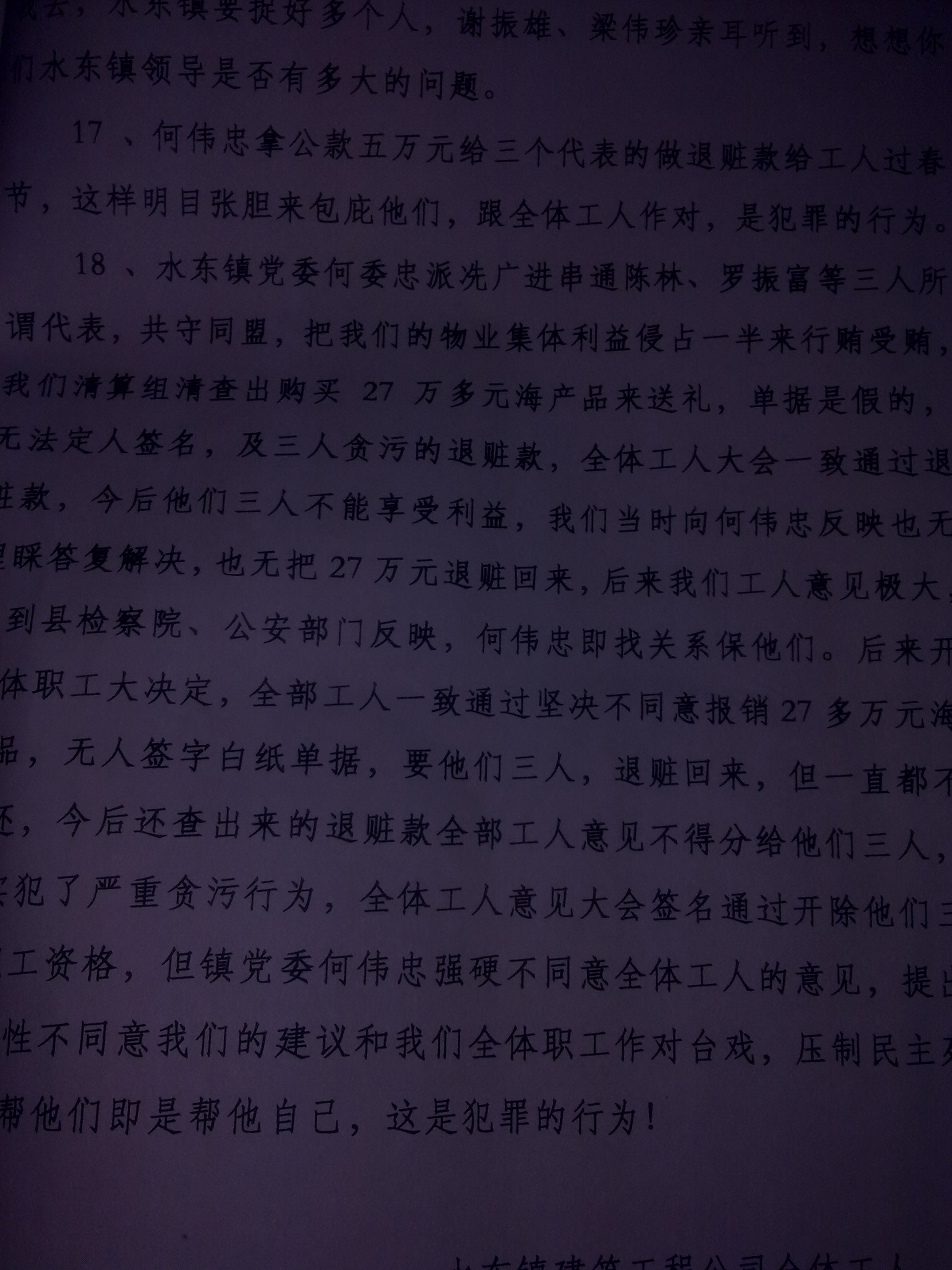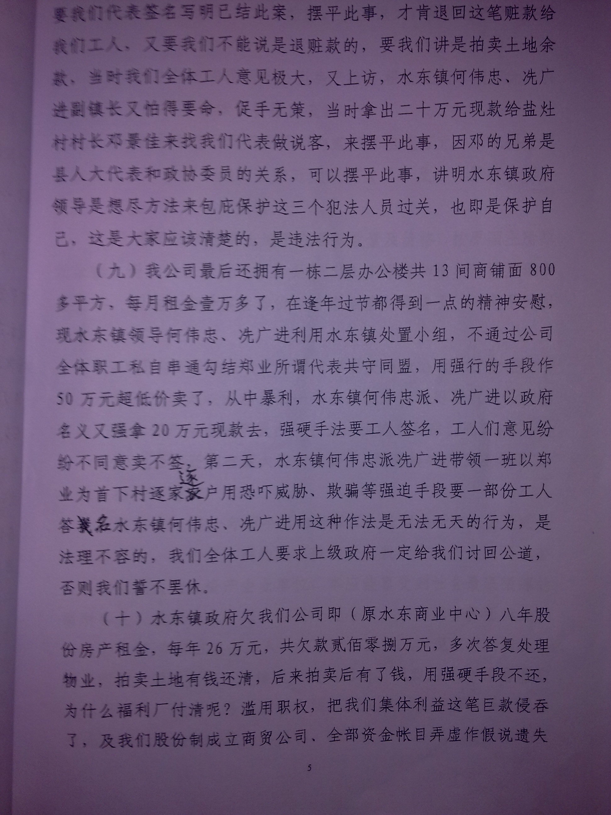 2007年何伟忠书记以水东镇政府的名义,非法刻有一个"水东镇处置小组"的公章,自作主张把我们(包括福利厂)拥有的七千多平米黄金商铺,当时价值三千多平方米作价1300\平方米拍卖,得款524万。然后何伟忠强行要与我们对半分成,从中非法夺取262万元私分。