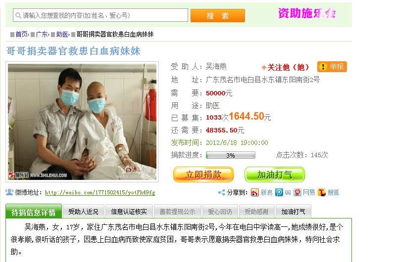 海燕妹妹是在上面治疗的,建议联系一下南方卫视今日一线节目组,以前很多这种例子都看到在这个节目播出,得到社会各界专注,而且经过媒体曝光的,一般医院都会减免一些费用(是医院要面子还是趁机做广告就不用管),毕竟电白范围内力量还是有限。