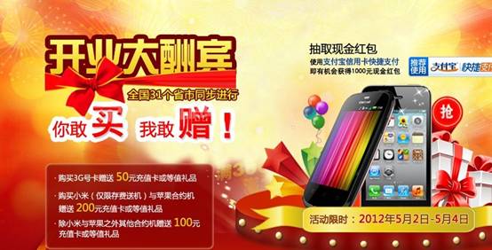 2012年5月2日到4日中国联通淘宝官方旗舰店开业大酬宾活动火热进行中!!!