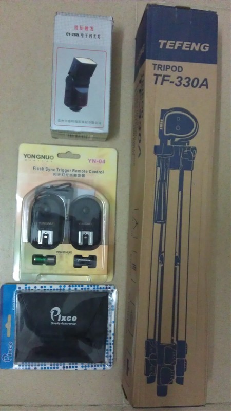 闪光灯+柔光罩+无线引闪触发器+闪光灯三脚架(可作相机脚架)