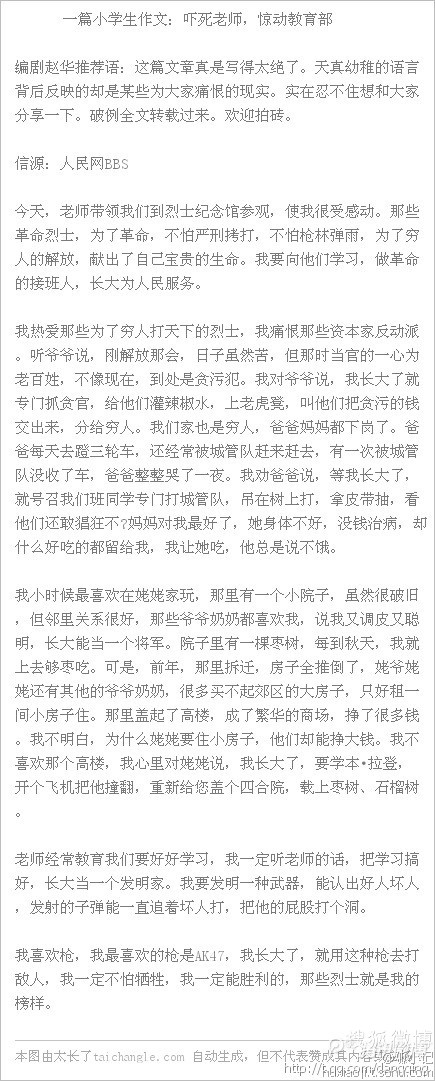 歌功颂德 荣誉主席 注册 2009-11-04 帖子 4,833 反馈评分 95 点数 71 2012-07-15 #1 @狐小记“我对爷爷说,我长大了就专门抓贪官,给他们灌辣椒水,上老虎凳,叫他们把贪污的钱交出来,分给穷人...”一篇小学生作文,吓死老师,惊动教育部…… 附件 1.jpg 183.9 KB · 查看: 343