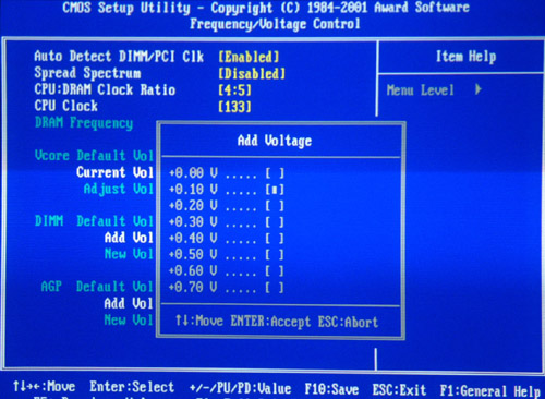 第三步不是必须的,就是来提高给DDR内存供电的电压,DIMM模组的默认电压为2.5V,如果内存品质不好,或是也超频了内存,那么可以适当提高一点内存电压,加压幅度尽量不要超过0.5V,后则有可能会损坏内存。由于我们在此用的是DDR333内存,完全可以在166MHz下正常运行,因此只是示意性的选择了增加0.1v,如图所示。