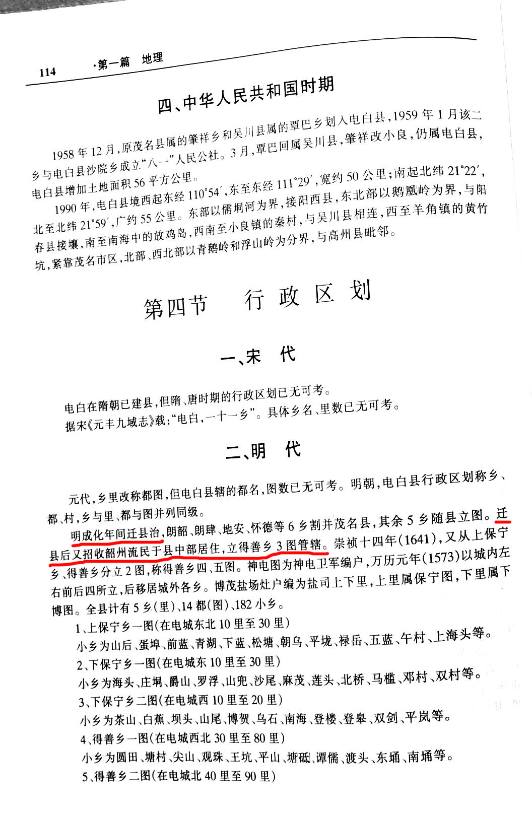 至明代,县行政区或称乡、都、村,乡与里、都与图并列同级、明成化年间迁县治,朗韶、朗肆、地安、怀德等六乡割并茂名县,其余五乡随县立图。