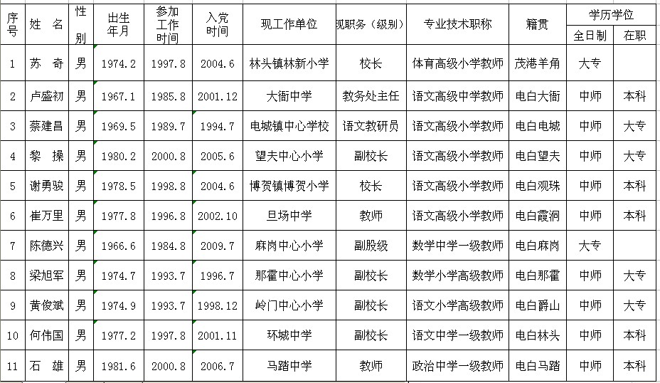 17 蔡锦祥 男 1969.3 1990.8 2000.7 电城镇中心小学 副校长 小学高级教师 "电白