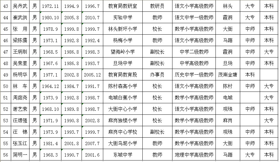 7 陈德兴 男 1966.6 1984.8 2009.7 麻岗中心小学 副股级 "数学中学