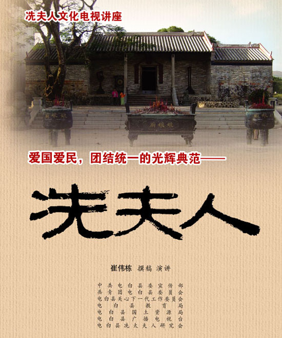 我一要好的朋友有幸被县委县政府邀请参加第二届电白县向前进主题活动暨岭南圣母文化节,带回来一本由崔伟栋主席创作的小说《冼夫人》和一本名为《爱国爱民,团结统一的光辉典范――冼夫人》的小册子。朋友向我介绍了这本小册子,说这就是崔伟栋主席在电白电视台所做的中华美德讲座的演讲稿。