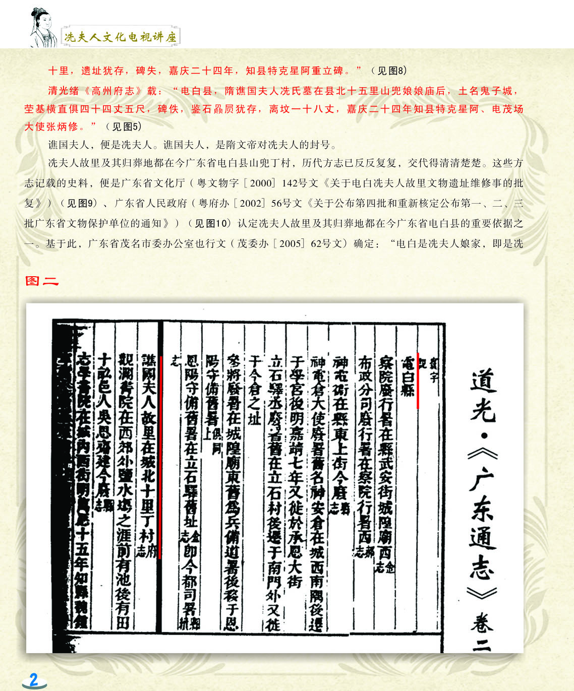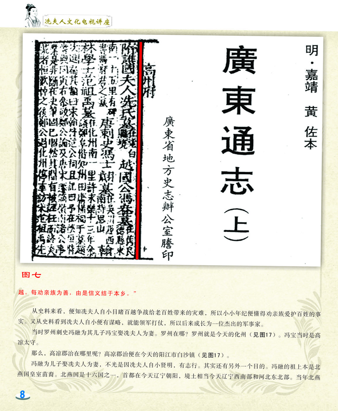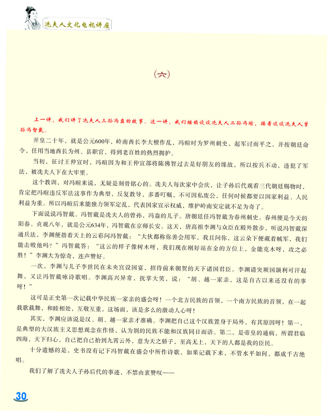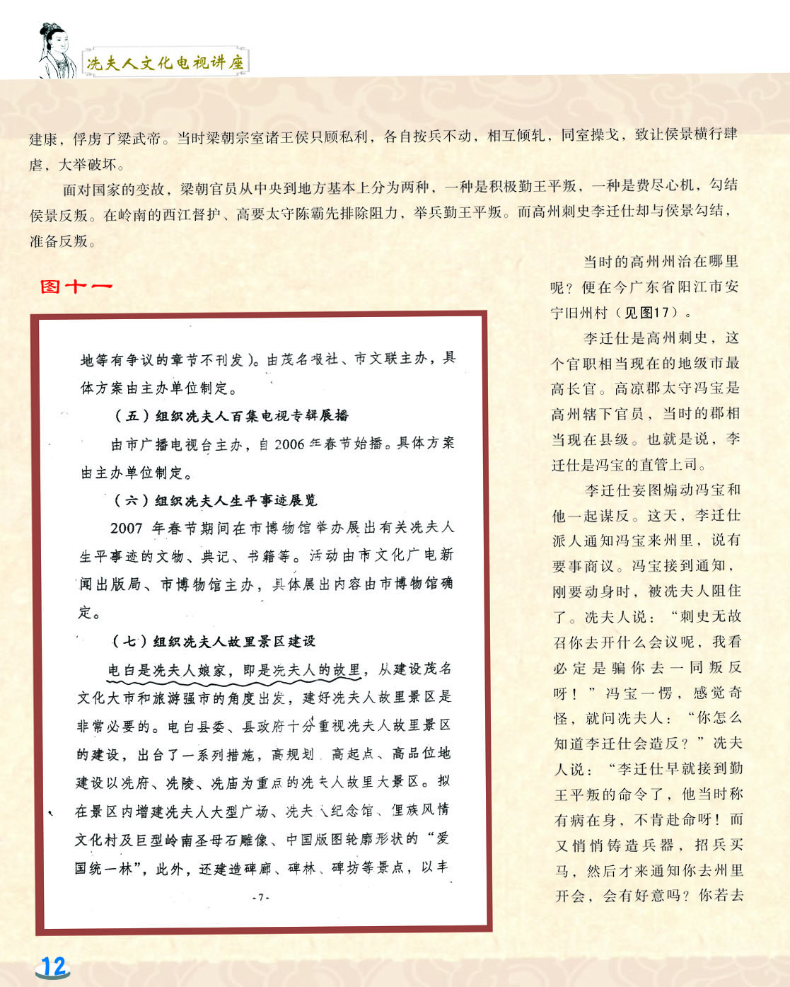 我细心地翻阅着这本小册子,第一感觉是这小册子非常精美,古色古香。第二感觉是内容图文并茂,深入浅出,用显浅的语言道出深刻的道理。内容共分六讲,第一和第二讲是关于冼太夫人的墓葬地以及故里问题,第三讲是关于冼太夫人在朱崖置州的故事,第四讲是关于冼太夫人为什么要派年仅九岁的儿子进京的问题,第五和第六讲是关于冼太夫人大义囚孙的故事以及冼太夫人的孙辈后人怎么以国家为重,坚决维护岭南乃至国家安定统一的故事。