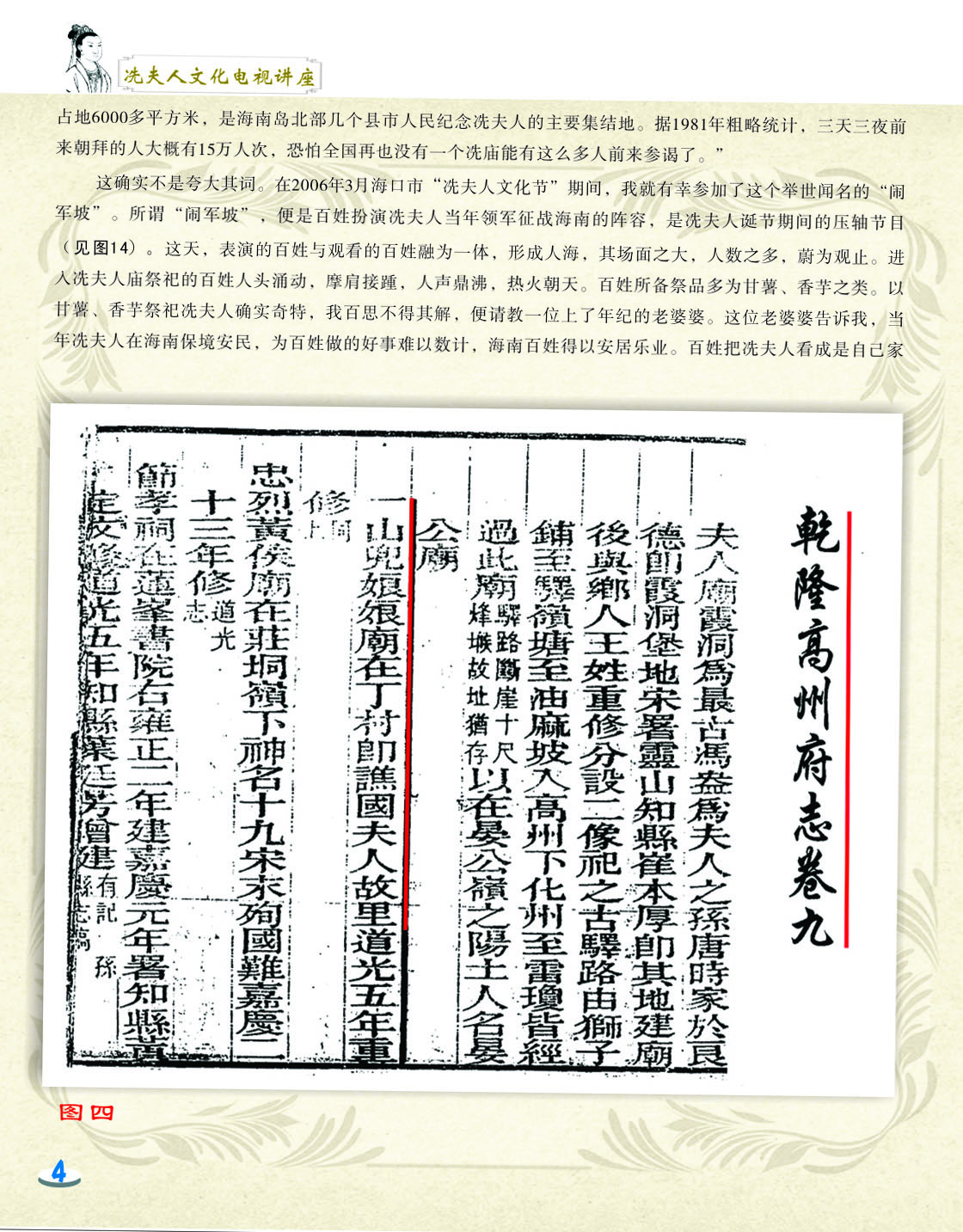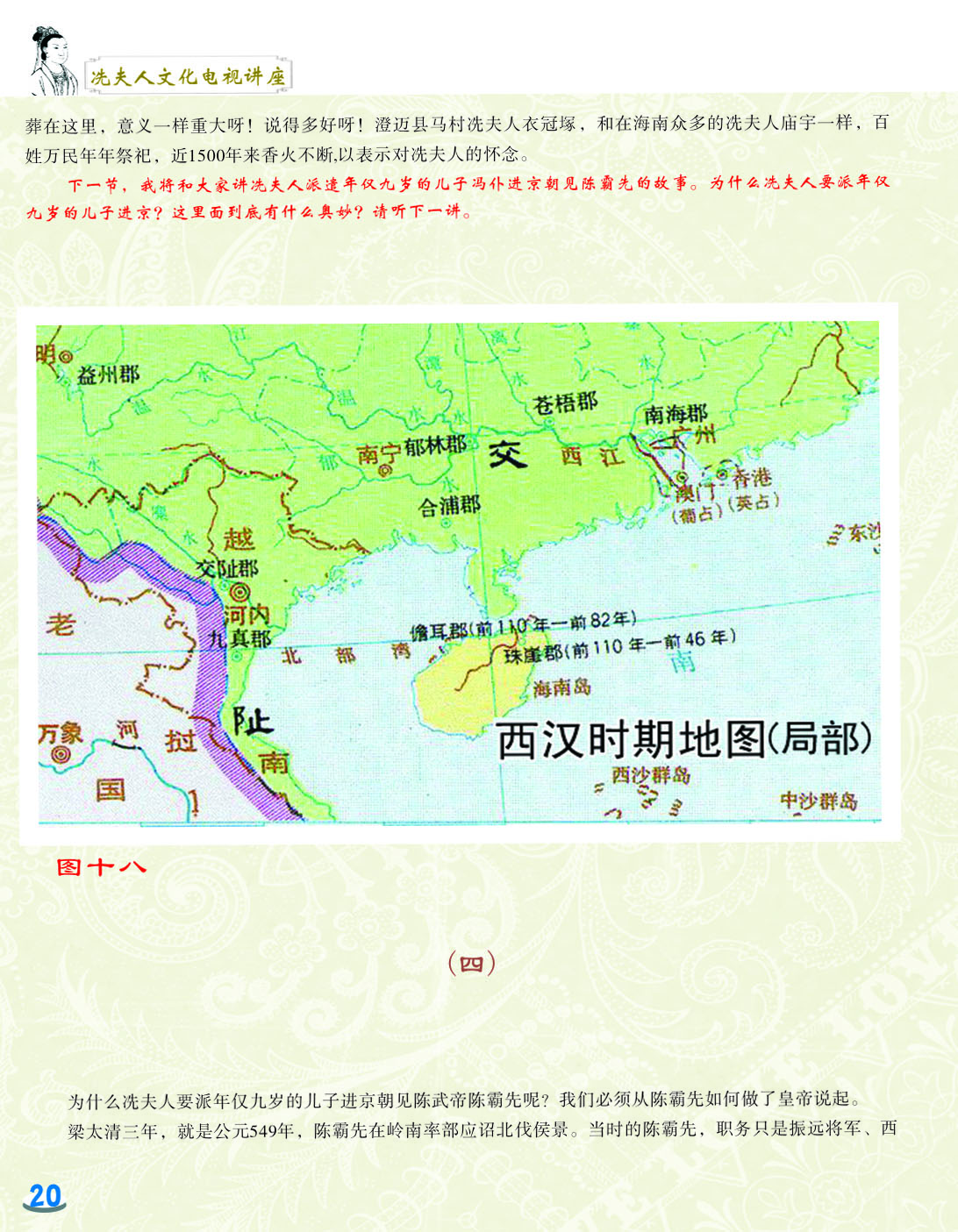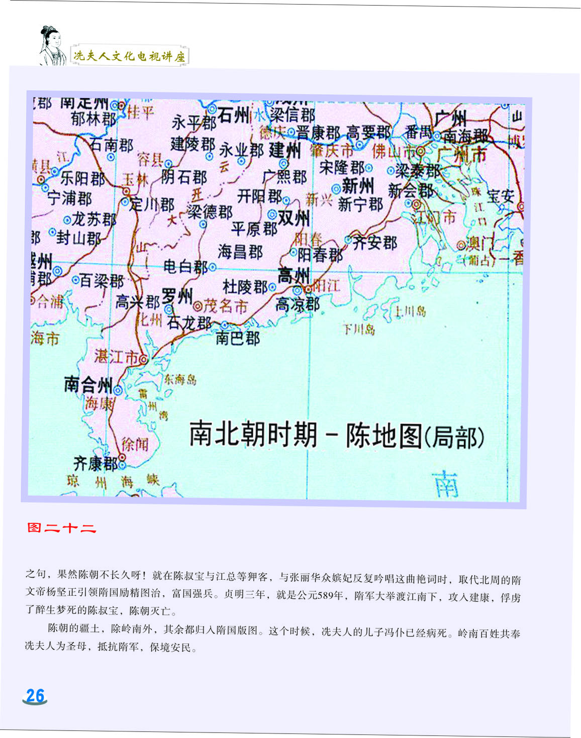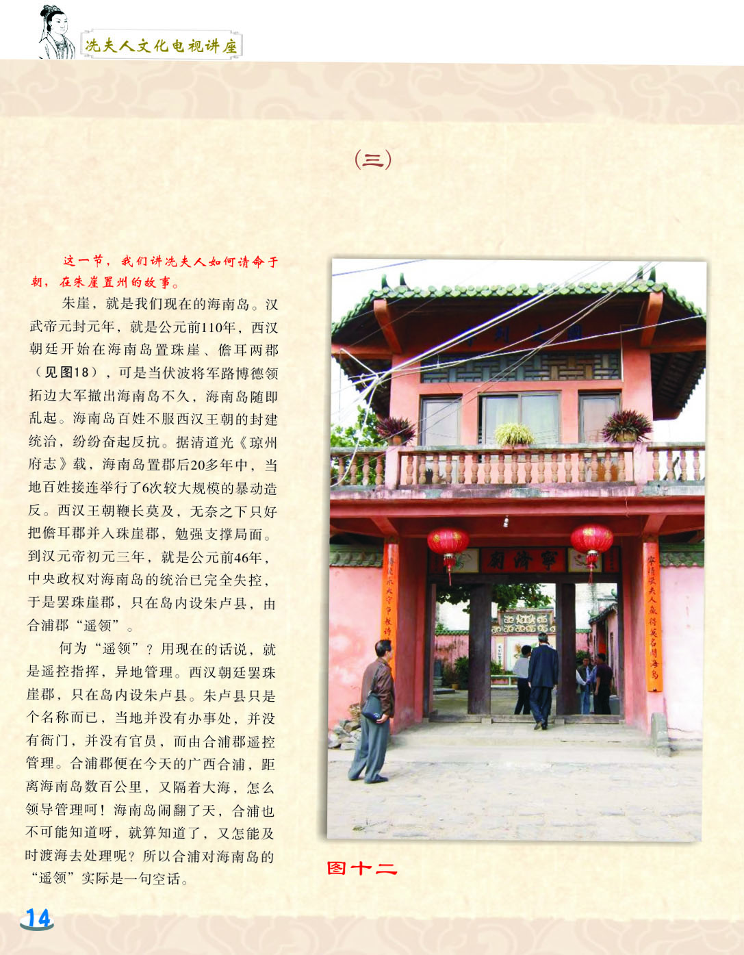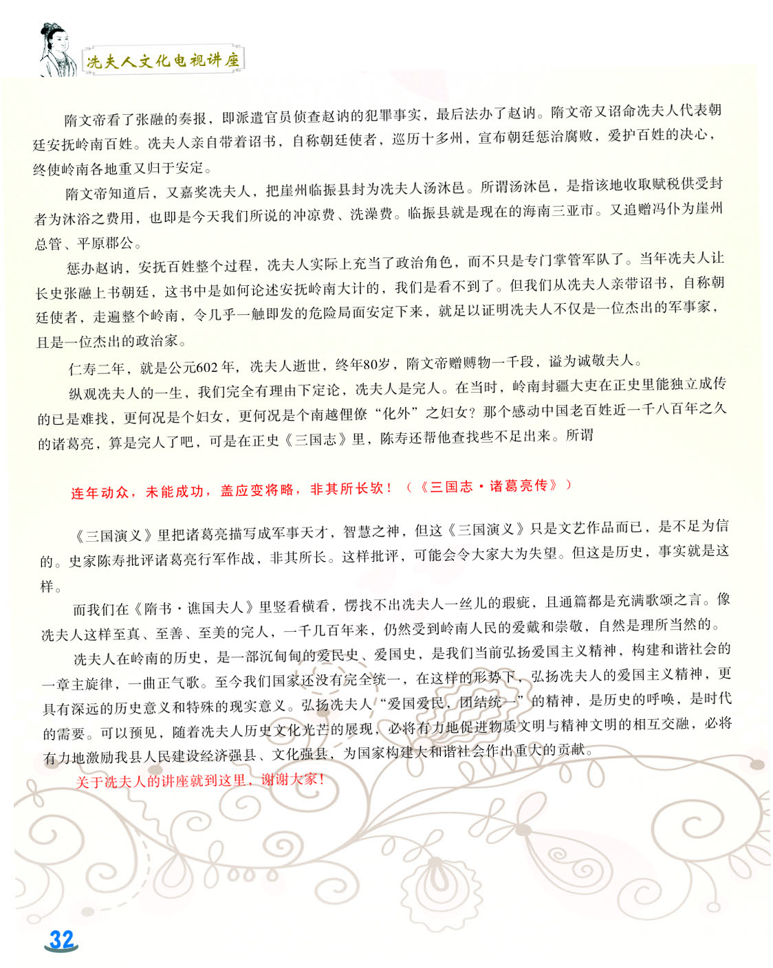 我细心地翻阅着这本小册子,第一感觉是这小册子非常精美,古色古香。第二感觉是内容图文并茂,深入浅出,用显浅的语言道出深刻的道理。内容共分六讲,第一和第二讲是关于冼太夫人的墓葬地以及故里问题,第三讲是关于冼太夫人在朱崖置州的故事,第四讲是关于冼太夫人为什么要派年仅九岁的儿子进京的问题,第五和第六讲是关于冼太夫人大义囚孙的故事以及冼太夫人的孙辈后人怎么以国家为重,坚决维护岭南乃至国家安定统一的故事。