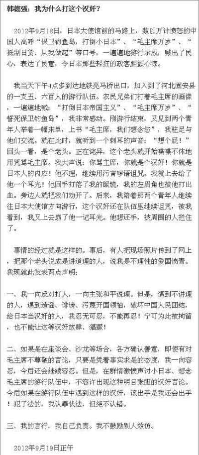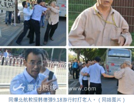 日前,北京举行纪念9.18事变81周年,在一场反日,保钓,勿忘国耻的5000多人大游行集合时,北京航空航天大学教授韩德强因一位八旬老人对打出毛主席我们想念您的横幅提出了反对意见,上前就了老人两个耳光,并称其是汉奸。继打人之后,韩德强在微博上发帖子声明,愿为自己的言行负责,但绝不认错。此消息迅速在网路上传开,遭到不少网友们吐糟。
