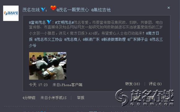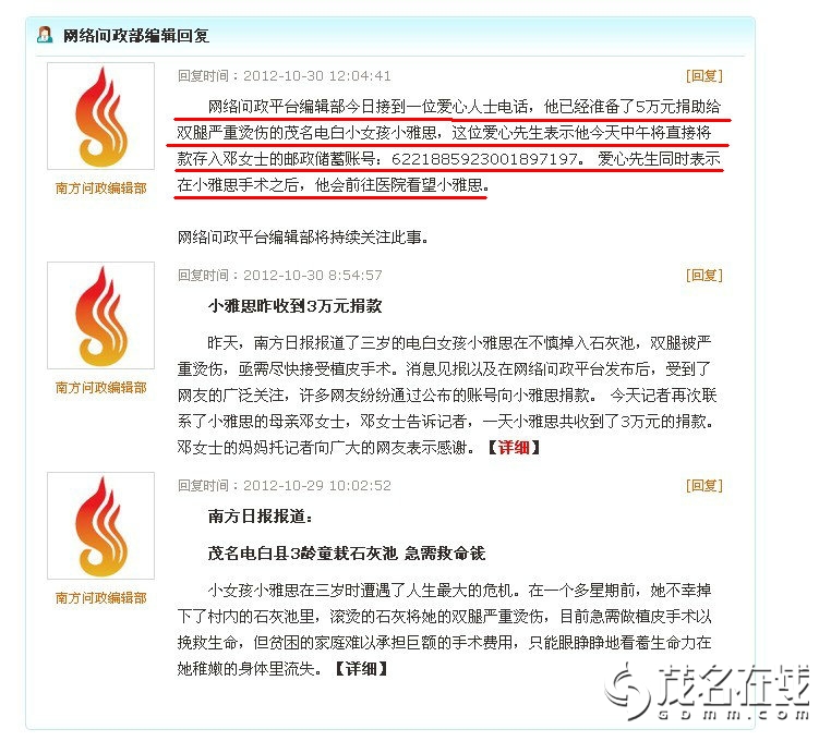 茂名在线网友一颗爱茂心:经茂名在线微博和网友三少爷等人的微博转发,特别是粉丝群巨大的微博局长李晓强转发后,引起很多知名博主的关注,如奥一网问政平台,南方民间智库,凤凰卫视前主持人杨锦麟等人,他们的积极转发让全国很多网友都知晓了小雅思的紧急状况,反响巨大!截至10月29日下午5点,小雅思妈妈的邮储帐号已经收到3万5千元的捐款,其中大部分是国内其他地区网友汇来的,我们相信,这场爱心接力一定会延续下去,油城人的爱心也一直充沛涌动,一定会在3天内为小雅思筹到10万救命钱的!谢谢! 茂名电视台一线新闻已播出新闻,呼吁广大热心市民踊跃捐款帮助小雅思 [attachmentid=302243] [attachmentid=302244]