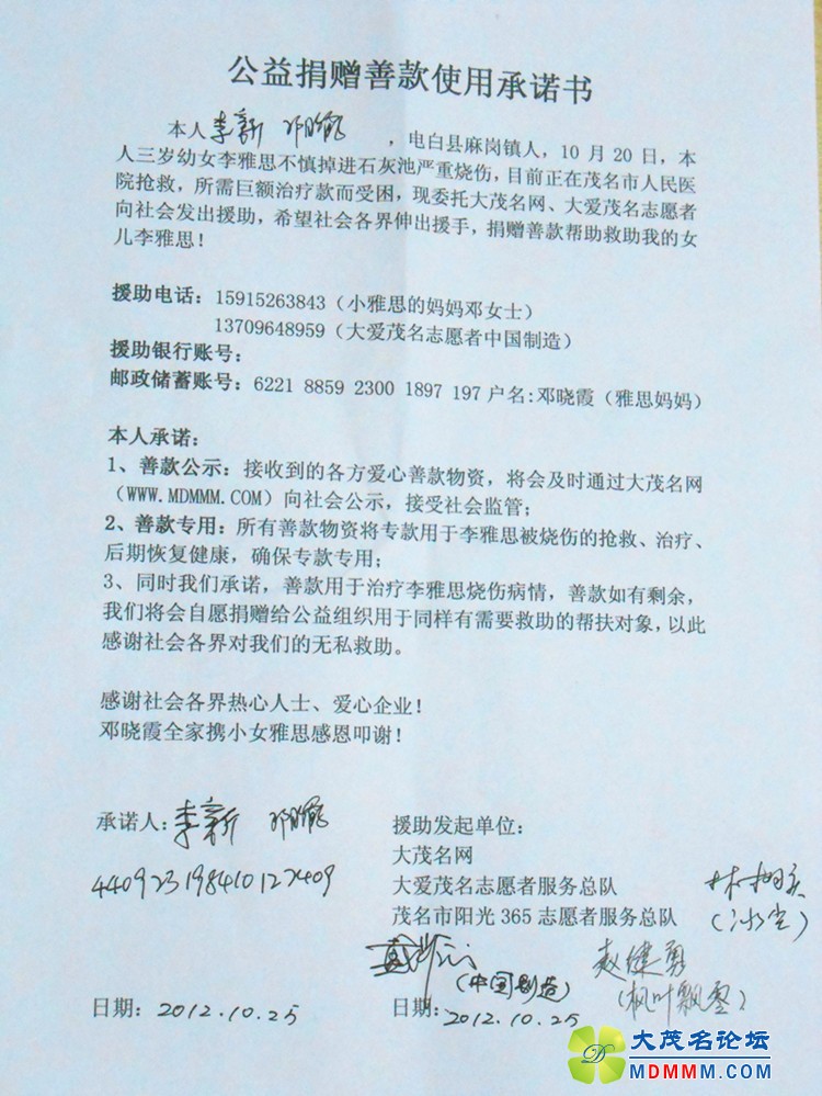 10月30日上午十时许,大爱茂名志愿者和阳光365志愿者相约来到茂名市人民医院烧伤科加护病房探望小雅思,向小雅思的主治医师和小雅思父母了解小雅思最新的救助情况。在交谈的过程中恰逢主治医师要帮小雅思烫伤的脚换药,也就是今天,真正看见了小雅思特种烫伤的两只稚嫩的小脚,外表几乎已经碳化了,黑黑的、黑黑的,当时陷入石灰池长达十多分钟才被救上来,双脚几乎烧熟了。 据小雅思的主治医师讲解,烧伤分为四种:轻度烧伤、中度烧伤、重度烧伤、和特重烧伤,而小雅思是属于特重烧伤,3度烧伤面积35%,双脚因为失去了皮肤的免疫,随时都可能会被感染,因此随时都是有生命危险的,植皮手术刻不容缓。 [attachmentid=302250] [attachmentid=302251] 邓晓霞女士承诺(小雅思妈妈): 1、善款公示:接收到的各方爱心善款物资,将会及时通过大茂名网(WWW.MDMMM.COM)向社会公示,接受社会监管; 2、善款专用:所有善款物资将专款用于李雅思被烧伤的抢救、治疗、后期恢复健康,确保专款专用; 3、同时我们承诺,善款用于治疗李雅思烧伤病情,善款如有剩余,我们将会自愿捐赠给公益组织用于同样有需要救助的帮扶对象,以此感谢社会各界对我们的无私救助。 [attachmentid=302252]