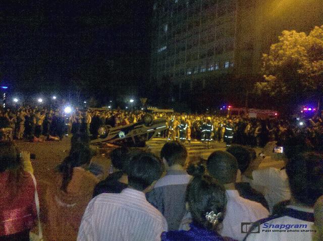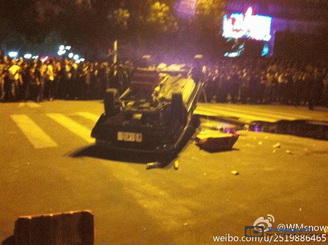 晚上7时,有一辆现代汽车,欲通过堵路群众,被拦截下来,车主拿出铁棍要打人,群众一怒之下把车掀翻。一辆试图通过的物流车亦被砸碎了玻璃和轮胎被放气。