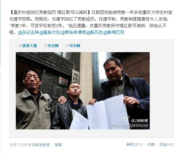 【重庆村官回忆劳教经历:唱红歌可以减刑】日前因发贴被劳教一年多的重庆大学生村官任建宇获释。获释后,任建宇回忆了劳教经历。 任建宇称,劳教制度随意性令人发指,“劳教1年,可签字后就变2年。”他还透露,在重庆劳教所中唱红歌可减刑,但他从不唱。 [attachmentid=303249]