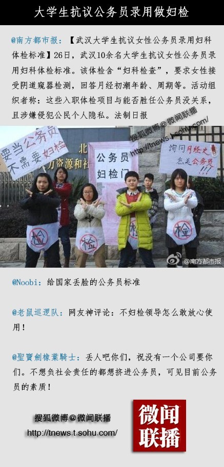 网转:26日,武汉10余名大学生抗议女性公务员录用妇科体检标准。该体检含“妇科检查”,要求女性接受阴道窥器检测,回答月经初潮年龄、周期等。活动组织者称:这些入职体检项目与能否胜任公务员没关系,且涉嫌侵犯公民个人隐私。