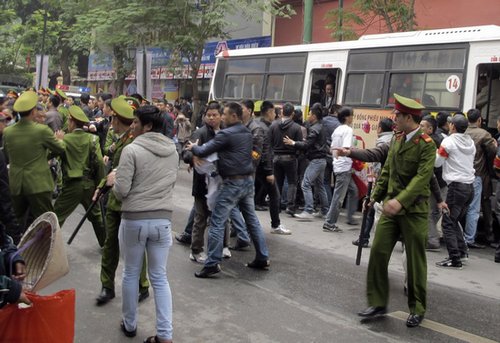 [attachmentid=304503]警方在游行进行半小时后采取驱散行动。有示威者告诉英国广播公司(BBC),警方至少逮捕了20人[attachmentid=304504]9日,越南河内,警察正将示威者押上一辆巴士。