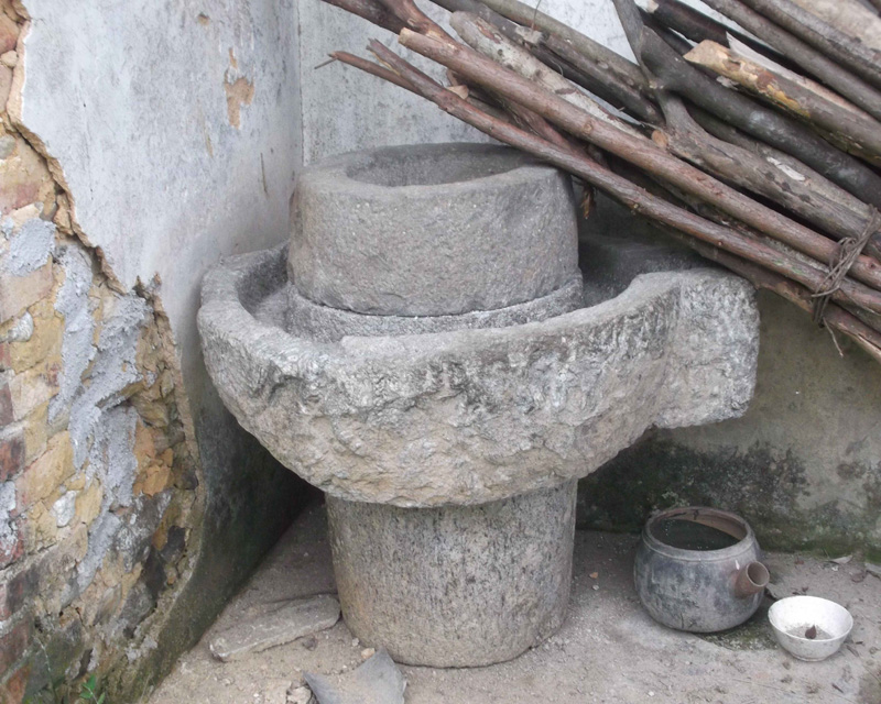 “笨重”二字是在大人一边推拉着这石磨一边擦汗时最易想到的。这家伙曾引人注目并且运作得比较忙碌是七十年代的事了。随着这家伙被大人推着发出“咯吱咯吱”的响声有白黄的浓液从四周流出,围观的小孩欢呼着、羡慕着、盼望着,想着鲜美爽滑的豆腐是从这里流出来的,大人小孩都热情守护着它,在磨完豆浆后,小孩帮着端水,大人将它擦洗干净,用碎布吸干,留待下一户人家日后的到来。这家伙自然成了全村几十户人的宠物,饿瘪了肚皮,还可以笑笑填补一下物质的空缺,这家伙可以说成了当时全村男女老少的盼头------不管是村里哪户人家磨豆腐,都如大喜事般很快被传开,“二叔公有豆腐吃了,爽了,今晚日子好过了”,“等四嫂下次磨豆腐,晚饭时间,亚坤你蹑手蹑脚去串她的门”......。笑着闹着,这石磨不但磨出了意志,而且磨出了欢乐,成了全村人的精神寄托,甚至成了生命支柱。