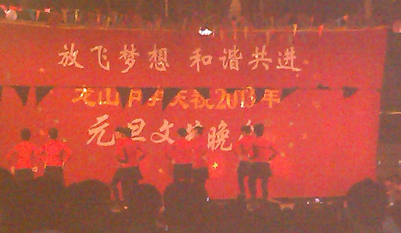 精彩纷呈的表演七点开始,九点半钟圆满结束。今年的晚会中除了往年的每班一个节目外,学校合唱团的歌声也融入喜庆的海洋,女教工队的广场舞更令人眼耳一新。 今年的节目经过彩排,一些水平不够高的节目被整改了。 有机会再上图。