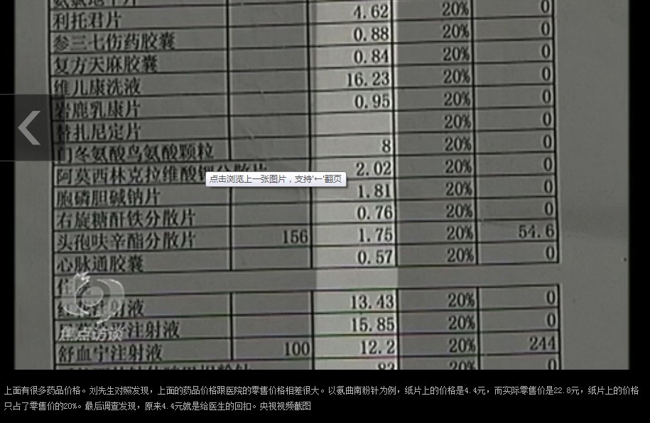 随后央视记者到医院调查了半个月后发现医生的桌子上也压着类似的纸片,药品后面写着“7”、“5”,医生辩解说是药品的代码。但是随后一名知情人士向央视记者提供了一些录像资料披露了医生收回扣的内幕。录像资料显示记录了几位医药代表和一名医生交易的过程。从录像上可以看到,这名医生经常会把车开到医院附近的停车场,然后开始打电话,随后会有不同的人先后过来进到车里。每个人见面的时间都很短,不超过五分钟。这名医生每次在停车场见的都是这几个人。这几个人进了车子后,都做了同一件事:给医生送钱。这些纸片就是给医生送回扣的依据,行话叫“药品销售明细单”。